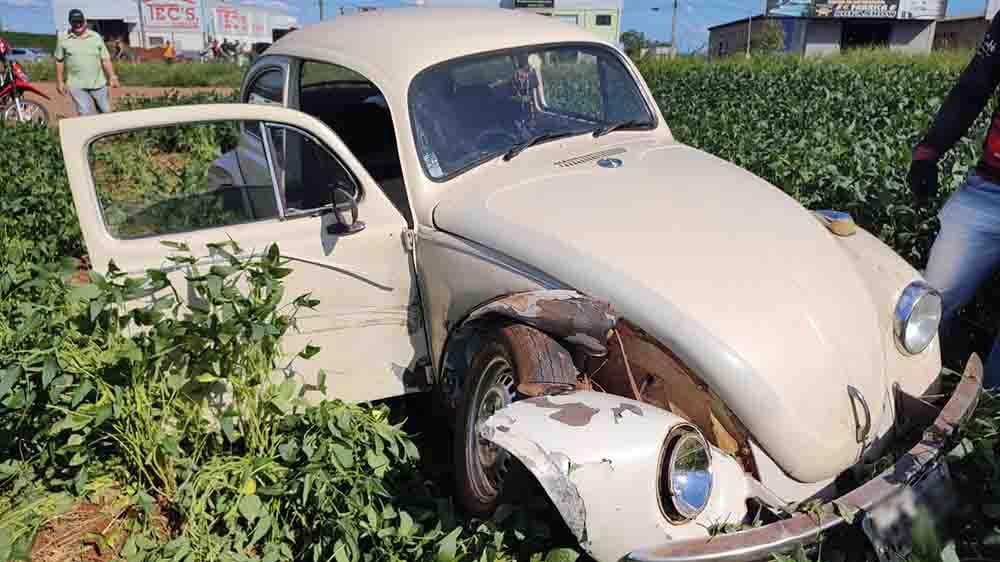 Com o impacto, o Corsa capotou e o Fusca saiu da pista e foi parar no meio de uma plantação de soja.