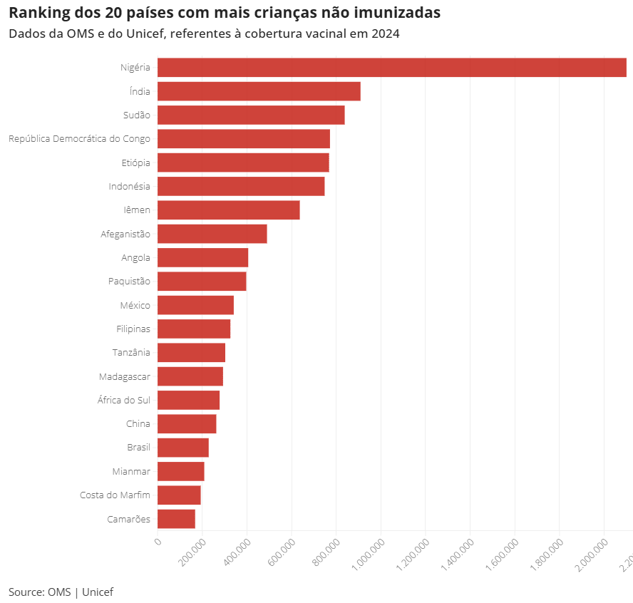 Em 2024, 229 mil crianças brasileiras não receberam nenhuma dose de vacina, um salto preocupante em relação às 103 mil registradas em 2023. Esse incremento posiciona o Brasil na 17ª posição no ranking global de crianças não imunizadas. No cenário latino-americano, o país é responsável por 16,8% das crianças sem vacinação, ficando atrás apenas do México, que contabiliza cerca de 341 mil crianças nessa situação.