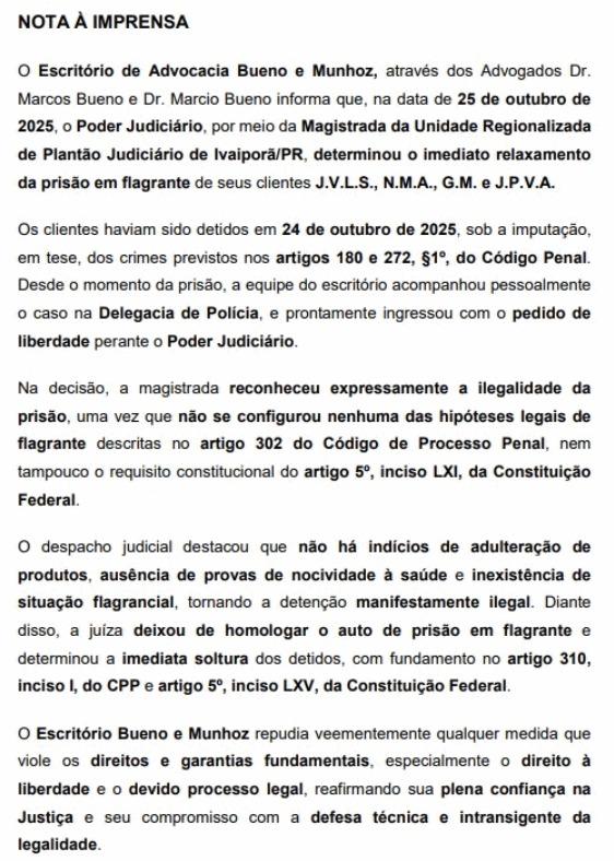 Por sua vez, o escritório de Advocacia Bueno e Munhoz, defensor dos detidos, informou que o Poder Judiciário concedeu o relaxamento imediato da prisão em flagrante dos clientes J.V.L.S., N.M.A., G.M. e J.P.V.A. A magistrada da Unidade Regionalizada de Plantão Judiciário de Ivaiporã/PR constatou ausência de flagrante delito, falta de provas de adulteração ou nocividade à saúde, e determinou a soltura com base nos dispositivos legais do Código de Processo Penal e da Constituição Federal. O escritório repudia qualquer violação dos direitos fundamentais e reafirma seu compromisso com a defesa legal rigorosa.