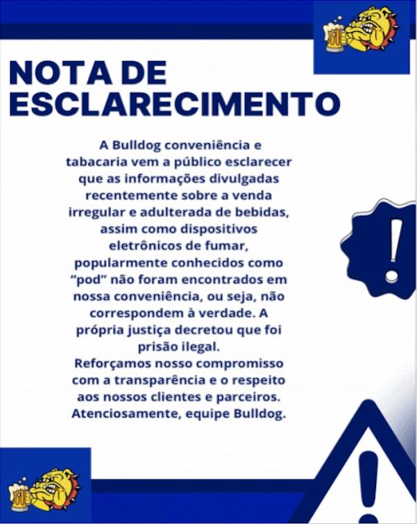 A Bulldog Conveniência e Tabacaria esclareceu que não foram encontrados produtos adulterados em seu estabelecimento, negando veementemente as alegações. A empresa reforçou sua transparência e o compromisso com clientes e parceiros, ressaltando que a justiça já reconheceu a prisão dos envolvidos como ilegal.