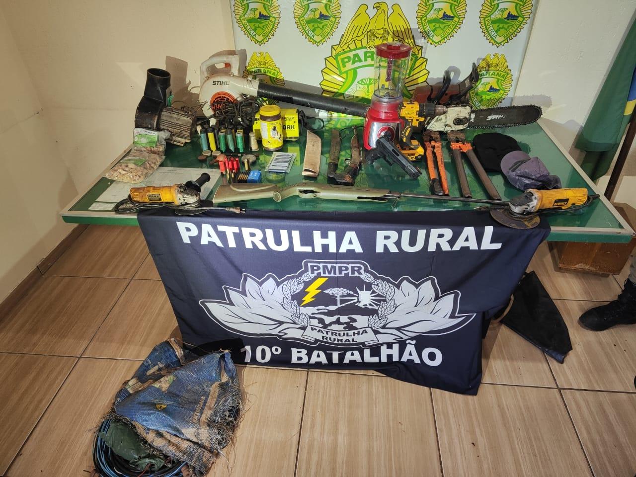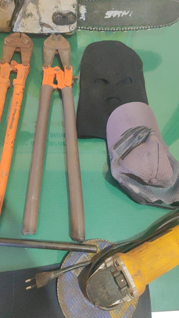 Em um dos alvos, as equipes encontraram objetos reconhecidos por uma vítima de furto, além de roupas e ferramentas idênticas às registradas por sistemas de vigilância no dia do crime. No mesmo local, foram apreendidas duas carabinas, um simulacro de pistola, diversas munições, uma motocicleta de trilha — suspeita de ser utilizada nos furtos — e outros itens de procedência duvidosa.