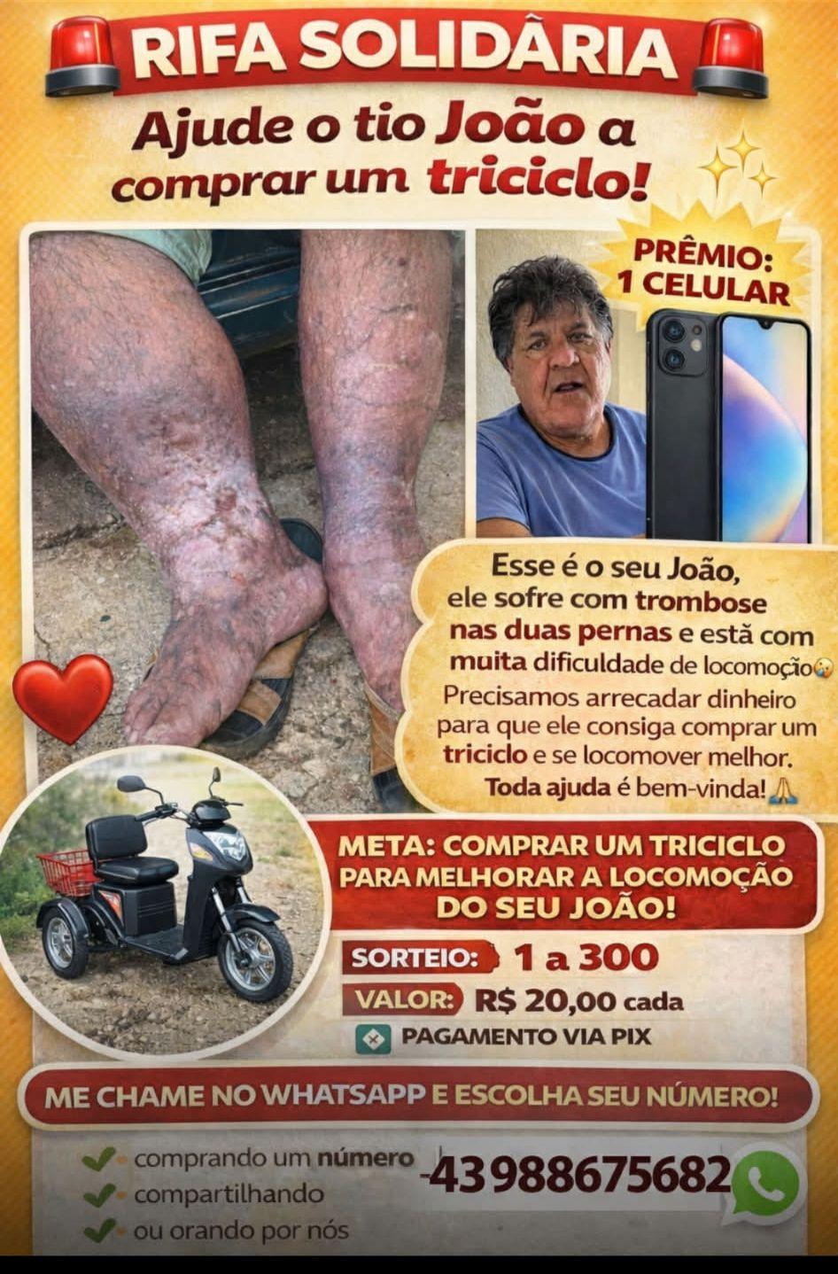A iniciativa partiu de um sobrinho de João, que compartilhou a história nas redes sociais, apelando por ajuda da comunidade. "Esse da foto é meu tio, João de Meira. Ele está enfrentando um momento muito difícil", escreveu o familiar, descrevendo o sofrimento diário causado pela trombose. O prêmio da rifa é um celular moderno, com cada número vendido por R$ 20,00. Interessados em contribuir podem entrar em contato diretamente com o organizador para reservar os números disponíveis.