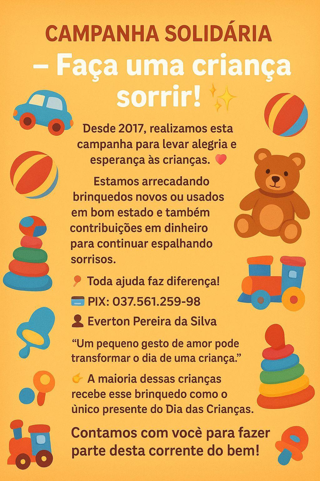 Para ajudar poderá ser realizado a doação de qualquer quantia para o Pix 037.561.259-68, em nome de Everton Pereira da Silva, no final da campanha será realizado uma prestação de contas pela equipe da campanha.